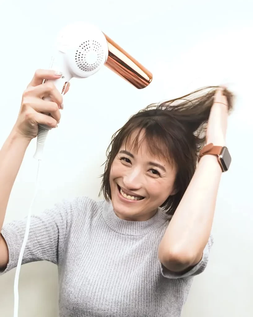 強温風では頭皮まで乾燥しすぎないように一定の距離を保ち、手で髪を散らしながら乾かしてください。